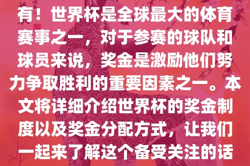 世界杯有奖金吗?是的,当然有!世界杯是全球最大的体育赛事之一,对于参赛的球队和球员来说,奖金是激励他们努力争取胜利的重要因素之一。本文将详细介绍世界杯的奖金制度以及奖金分配方式,让我们一起来了解这个备受关注的话题。