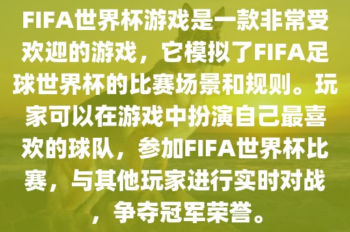 FIFA世界杯游戏是一款非常受欢迎的游戏,它模拟了FIFA足球世界杯的比赛场景和规则。玩家可以在游戏中扮演自己最喜欢的球队,参加FIFA世界杯比赛,与其他玩家进行实时对战,争夺冠军荣誉。