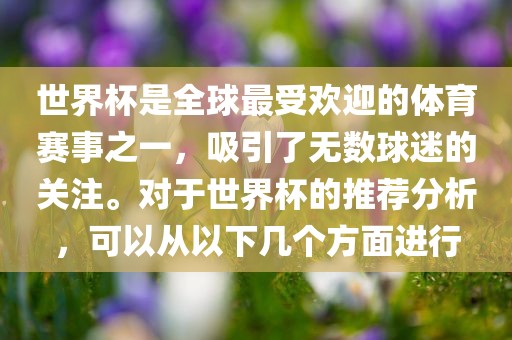 世界杯是全球最受欢迎的体育赛事之一,吸引了无数球迷的关注。对于世界杯的推荐分析,可以从以下几个方面进行