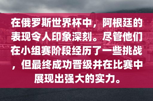 在俄罗斯世界杯中,阿根廷的表现令人印象深刻。尽管他们在小组赛阶段经历了一些挑战,但最终成功晋级并在比赛中展现出强大的实力。