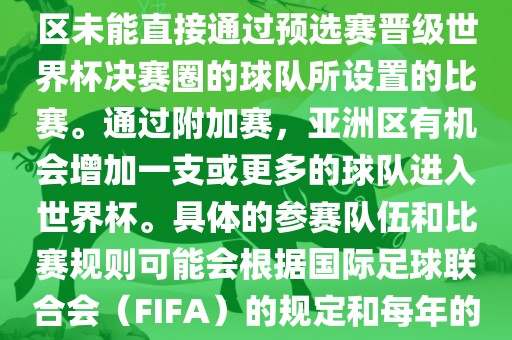 亚洲世界杯附加赛是针对亚洲区未能直接通过预选赛晋级世界杯决赛圈的球队所设置的比赛。通过附加赛,亚洲区有机会增加一支或更多的球队进入世界杯。具体的参赛队伍和比赛规则可能会根据国际足球联合会(FIFA)的规定和每年的具体情况有所不同。