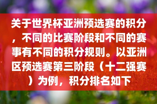 关于世界杯亚洲预选赛的积分,不同的比赛阶段和不同的赛事有不同的积分规则。以亚洲区预选赛第三阶段(十二强赛)为例,积分排名如下