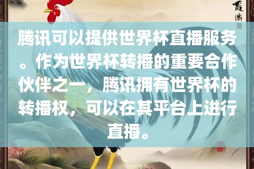 腾讯拥有世界杯转播权,将提供世界杯直播服务。作为重要合作伙伴之一,腾讯在其平台上进行世界杯比赛的直播,让观众们能够实时观看赛事,感受比赛的激情与精彩。