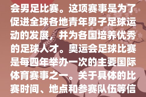 奥运足球世界杯是国际足联组织的U-23男子足球锦标赛,旨在促进全球青年男子足球运动的发展并为各国培养足球人才。该赛事每四年举办一次,是主要的国际体育赛事之一。关注国际足联官网或体育新闻网站可获取比赛时间、地点和参赛队伍等最新信息。