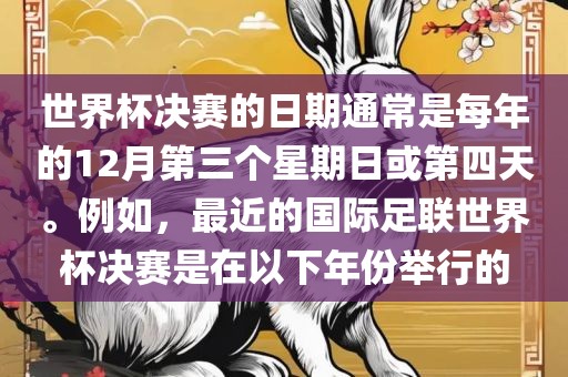 世界杯决赛的日期通常是每年的12月第三个星期日或第四天。例如,最近的国际足联世界杯决赛是在以下年份举行的