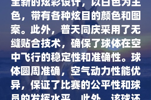 南非世界杯官方用球名为普天同庆,由阿迪达斯公司设计生产。该球以白色为主色,采用炫彩设计和无缝贴合技术,灵感来源于南非的标志性颜色和国旗图案。球体圆周准确,空气动力性能优异,确保了比赛的公平性和球员发挥水平。内置传感器技术可记录比赛精彩瞬间。普天同庆是一款设计精良、性能卓越的足球。